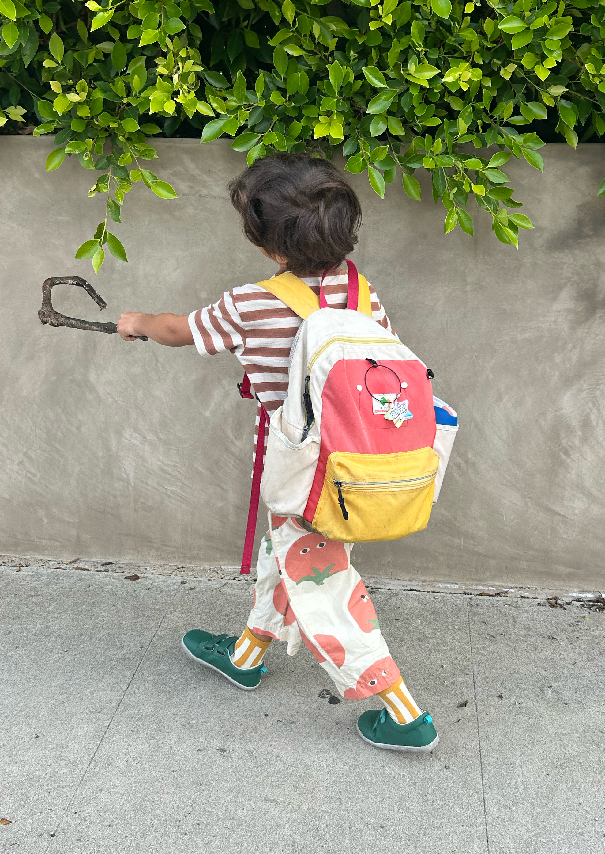 Organic cotton, loose fit, elastic waist, cropped legs.